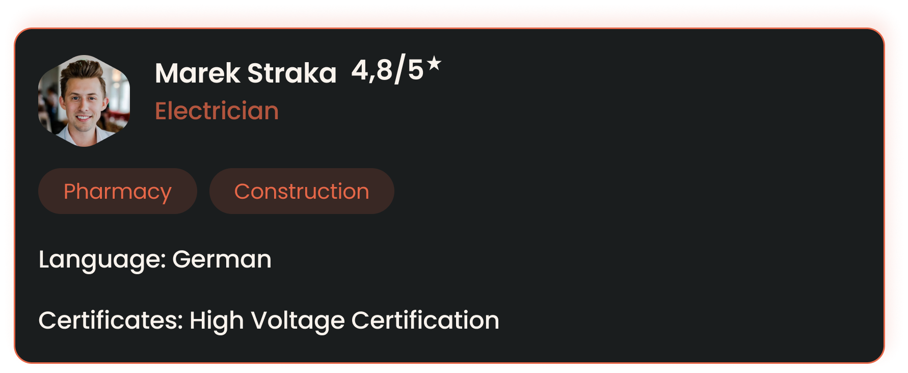 Interná databáza pracovníkov Ti umožní mať prehľad o uložených profiloch. Vďaka filtrovaniu, možnosti triedenia a prehľadnému zobrazeniu môžeš jednoducho spravovať svojich pracovníkov a projekty.